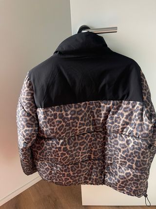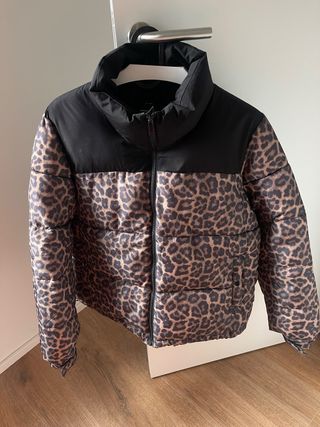 Chaqueta acolchada con un llamativo forro interior de estampado leopardo. - Cierre de cremallera. - Bolsillos frontales. - Cuello con capucha. - Gran capacidad de abrigo. - La talla equivale a una S oversize.