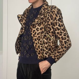 Chaqueta de estilo motero con estampado de leopardo. - Diseño corto. - Cierre de cremallera. - Bolsillos frontales con cremallera.