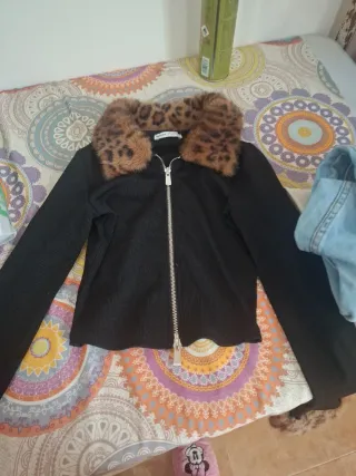 Chaqueta con cremallera, de mujer , de tela fina sin forro. - Para una talla 36 , aunque en la etiqueta pone 34. - estampado leopardo negro y gris. - bolsillos laterales.
