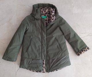 Chaqueta de la marca Benetton con un diseño moderno y llamativo. - Color verde exterior. - Forro interior con estampado de leopardo. - Cierre de botones y cremallera. - Bolsillos laterales con cremallera.
