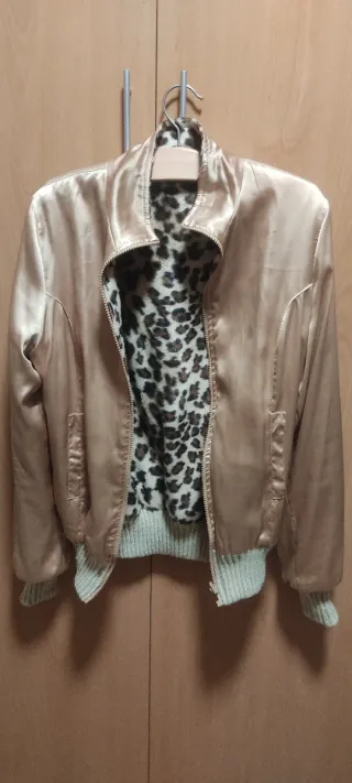 Chaqueta con un llamativo forro interior. - Diseño exterior liso en tono dorado. - Forro interior con estampado de leopardo. - Cremallera frontal.