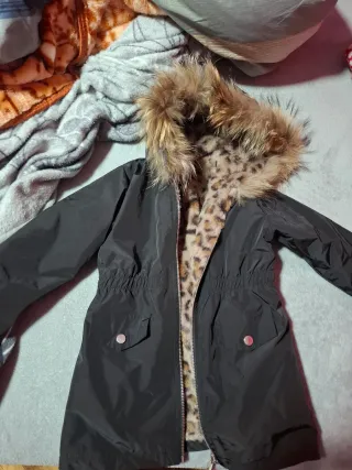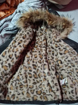 Chaqueta de niña con un diseño moderno y cálido. - Capucha con pelo sintético. - Forro interior con estampado de leopardo. - No contiene bolsillos reales No se a usado