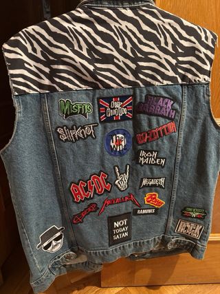 Chaqueta vaquera estilo chaleco con parches y detalles únicos. Como nueva. - Parche Arwads con llamas. - Parche Punk's Not Dead. - Parche Jimi Hendrix. - Detalle de estampado de leopardo rosa en la solapa. - Banda de cebra en los hombros. - Parche In Memory Of Opie en la parte inferior. Todo cosido a mano y con mucho cariño
