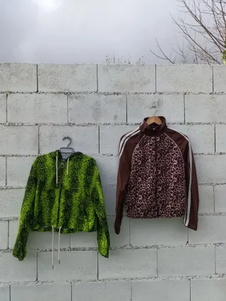 Pack de 2 chaquetas estilo cortavientos perfectas para looks streetwear, sporty y de entretiempo. Súper combinables y muy favorecedoras. ✨ Chaqueta leopardo – Shein • Talla XS • Cremallera frontal • Ligera y cómoda ✨ Chaqueta verde animal print – Primark • Talla XS • Con capucha y ajuste en la cintura • Corte cropped moderno ⭐ Solo usadas 2 veces ⭐ Estado perfecto, como recién compradas ⭐ Sin defectos ni desgaste Ideal para outfits casual, Y2K, sporty o urbano. Se venden juntas para aprovechar el pack 💚 📦 Envío rápido