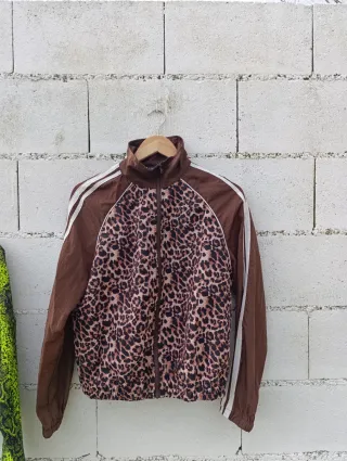 Chaqueta con un llamativo estampado de leopardo, ideal para un toque retro. - Diseño con cuello alto. - Cremallera frontal. - Mangas con detalles de rayas. - Puños y bajo elásticos. Usada una vez. Venta en mano pago en efectivo y precio negociable.