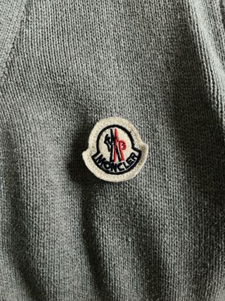Chaqueta de punto Moncler en color gris. Presenta un diseño clásico con cuello de solapa y cierre de botones. - Detalle de logo Moncler en el pecho. - Rayas tricolor en la manga. - Dos bolsillos delanteros. Preciosa talla M , original Moncler, muy buen estado