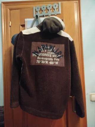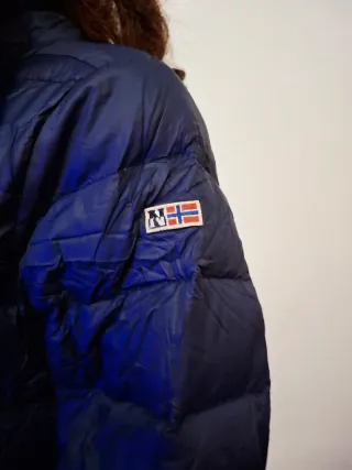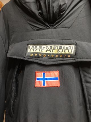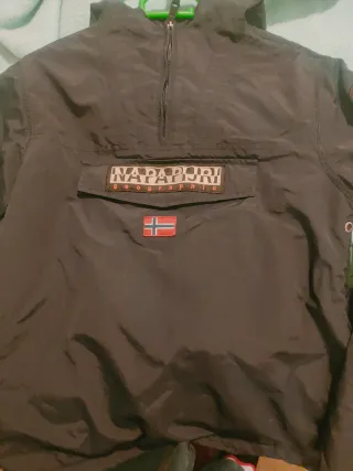 Chaqueta estilo anorak de la marca Napapijri. usada un día unas horas. - Diseño con capucha. - Bolsillo frontal tipo canguro. - Cierre parcial con cremallera. - Parche con logo en el pecho. - Bandera de Noruega en parche.