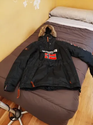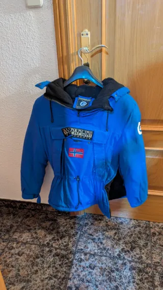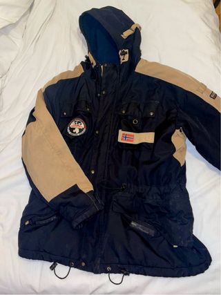 - Auténtica chaqueta Napaijri Geographic Voyage de alta tecnología impermeble para frío y lluvia en montaña. - Fabricada con tela de primera calidad súper resistente de la marca DuPont en cordura de 300gr m2 impermeable con cobertura de Teflon para repeler el agua. - Especial para montaña y bajas temperaturas. Súper caliente! - Combinación de colores beige y negro. - Detalles de logo Napapijri Geographic en la espalda y manga. bandera Noruega en pecho y escudo conmemorativo Anthatic Research Prigram / GPS Mapping Surveys. - Capucha con forro polar ajustable con cordón. - Muy cuidada!!!