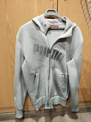 Chaqueta deportiva Puma de neopreno en color gris. Ideal para un estilo casual y cómodo. - Cierre de cremallera frontal. - Capucha con cordones. - Bolsillos laterales. - Logo de Puma estampado.
