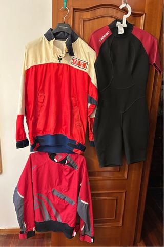Conjunto de ropa deportiva que incluye un neopreno y dos chaquetas cortavientos. - Neopreno de manga corta. - Chaqueta cortavientos con cremallera frontal. - Segunda chaqueta cortavientos con diseño deportivo.