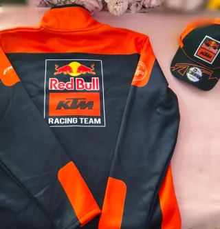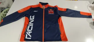 Chaqueta deportiva de la marca KTM, con un diseño llamativo en azul y naranja. - Cierre de cremallera frontal. - Paneles laterales en color naranja. - Logo de Red Bull KTM Racing Team en el pecho. - Inscripción 'RACING' en grande en la parte frontal izquierda.