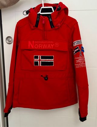 Chaqueta sin cremallera (tipo sudadera) de Geographical Norway en color rojo, ideal para el invierno. - Diseño con capucha. - Bolsillo frontal tipo canguro. - Parches decorativos con banderas y texto. - Cremallera parcial en el cuello. - Goma en cintura para ajustar - Tallaje pequeño