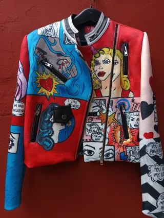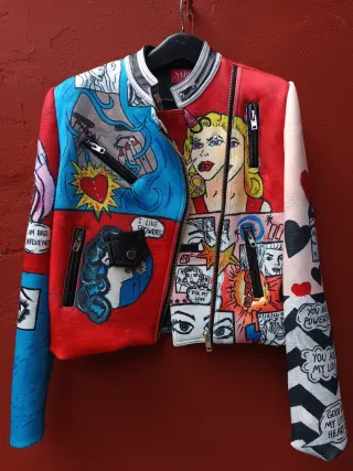 Chaqueta biker con un diseño único y llamativo, inspirada en el cómic - Estampado de cómic en toda la prenda. - Cierre de cremallera frontal. - Cuello con solapas. - Neopreno