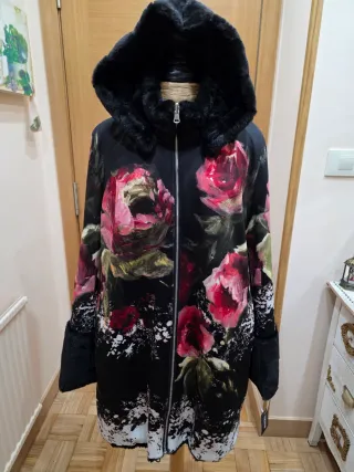 Chaqueta de neopreno con un estampado floral vibrante y detalles de pelo. - Diseño con capucha. - Cierre de cremallera frontal. - Puños y capucha con pelo sintético. - Estampado de rosas en tonos rosas y negros. Medidas de pecho 120€ largo 90cm su precio 280€ a estrenar es precioso y muy abrigoso reversible