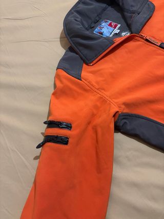 Chaqueta de neopreno con diseño moderno y llamativo. - Combinación de colores naranja y gris. - Cierre de cremallera frontal. - Cuello alto para mayor protección. - Bolsillos laterales con cremallera. Hombros 47 cm · Manga 61,5 cm · Pecho 54 cm · Largo 69,5 cm