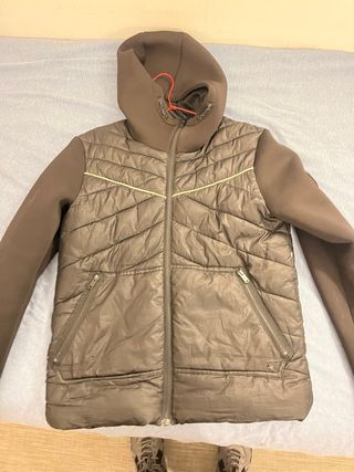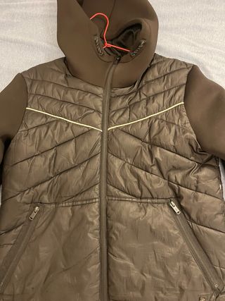 Chaqueta larga con paneles acolchados y mangas de tejido técnico. Casi nueva El material es como neopreno y por dentro como forro polar. Fina pero abriga - Cierre completo con cremallera. - Capucha integrada.