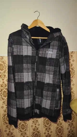 Chaqueta con estampado de cuadros en tonos negros y grises. Con forro y muy caliente, el exterior estilo neopreno por lo que no moja - Diseño de cuadros superpuestos. - Cierre de cremallera frontal. - Capucha integrada.