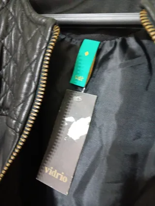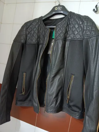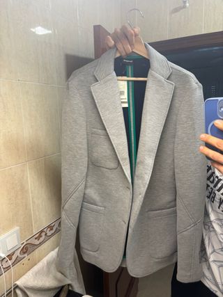 Chaqueta gris con aspecto de neopreno. El bajo y las mangas no están rematados, el diseño es así. Como se puede apreciar tiene bastante cuerpo. Talla 38, yo uso una 36 y me gusta cómo me queda (holgada). Enviaría medidas si hay interés Es muy estilosa, especial de Naf Naf con un diseño moderno y tejido tipo neopreno. - Cierre de cremallera frontal. - Dos bolsillos superiores con solapa. - Puños anchos.