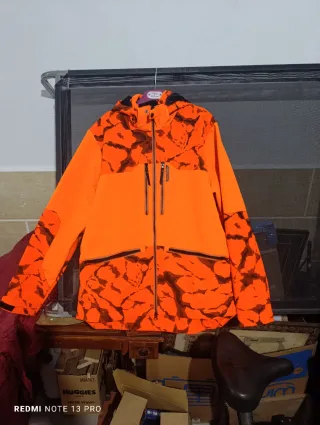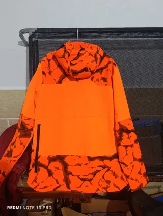 Talla XL -Chaqueta de alta visibilidad con diseño camuflado. - Color naranja flúor con estampado. - exterior tipo neopreno con forro interior. - Cremalleras frontales y en bolsillos. - Capucha integrada. - nueva usada 2 h se utizo 1 vez para una montería y paso toda la mañana en el coche, no se a vuelto a utilizar por aumento de talla
