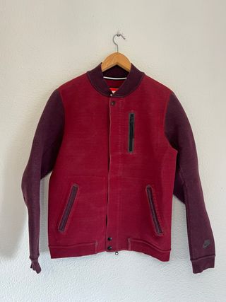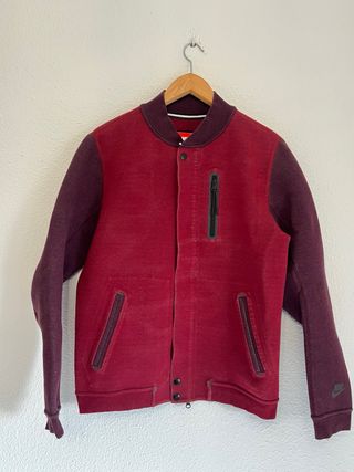 Chaqueta Nike Bomber Varsity · Granate / Burdeos · Talla M Chaqueta Nike original estilo universitario en color granate bitono. • Detalles: Cierre frontal con cremallera y botones de clip para mayor protección. • Bolsillos: Dispone de un bolsillo vertical con cremallera en el pecho y dos bolsillos laterales. • Diseño: Logo Nike en la manga izquierda. Tejido cómodo y abrigado, ideal para uso diario o deporte. • Estado: Buen estado general (se aprecian ligeros signos de uso normales en este tejido). #nike #chaquetanike #nikevarsity #bombernike #granate #burdeos #nikesportswear #streetwear #vinted #wallapop