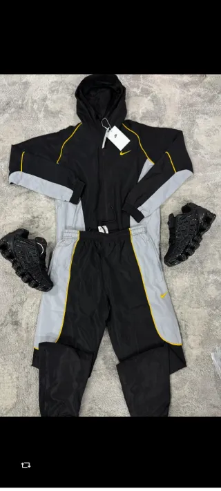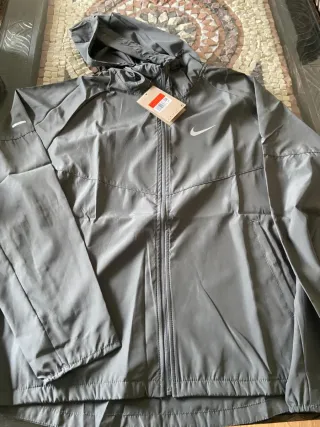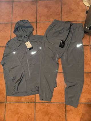 Conjunto deportivo Nike para running. - Chaqueta con capucha. - Pantalones con cremalleras en los tobillos. - Logos reflectantes. Chaqueta talla L y pantalón XL. nuevos con las etiquetas