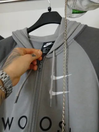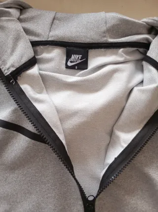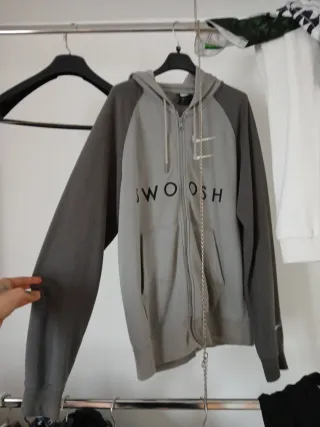 Chaqueta deportiva Nike de color gris, con cierre completo de cremallera. - Logo de Nike bordado en el pecho. - Bolsillos frontales tipo canguro. - Capucha con cordones ajustables. - Puños y dobladillo elásticos. -Es S pero es mas grande