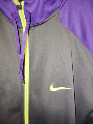 Chaqueta técnica deportiva Nike con un diseño moderno y funcional. - Paneles en color morado y gris. - Cremallera frontal. - Capucha integrada. - Logo de Nike en el pecho. - Interior técnico therna fit ( forro polar interior)