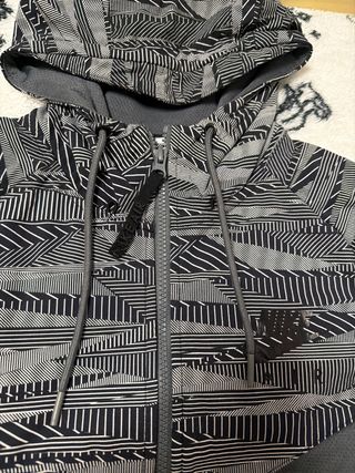 Chaqueta deportiva Nike Tech con un diseño moderno en gris y blanco. Perfecta para actividades al aire libre. - Cierre de cremallera frontal. - Capucha ajustable. - Bolsillos laterales con cremallera.