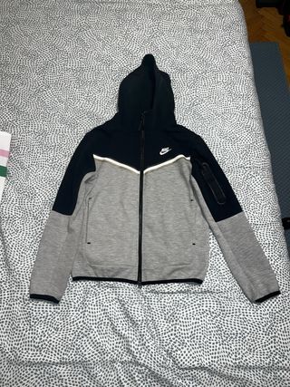 Chaqueta deportiva Nike Tech Fleece con un diseño moderno y cómodo. - Paneles en color negro y gris. - Cremallera frontal completa. - Bolsillos laterales con cremallera. talla como una M