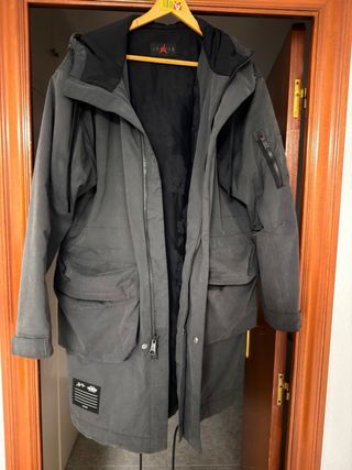 Chaqueta Jordan de color gris. Diseño moderno y funcional. - Capucha ajustable con cordones. - Bolsillos frontales con solapa. - Cierre central. - Puños ajustables.