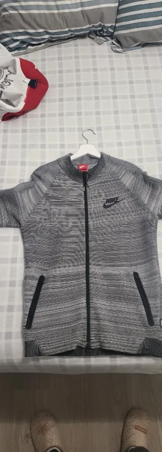 Chaqueta deportiva Nike Tech Fleece con un diseño moderno y cómodo. - Paneles en color negro y gris. - Cremallera frontal completa. - Capucha integrada. - Bolsillo con cremallera en la manga. - Talla M pero da menos talla - Calidad 10/10 -Precio negociable -Envío 24-48h