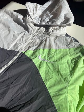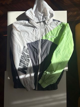 Chaqueta cortavientos de la marca Nike, ideal para actividades al aire libre. Presenta un diseño moderno y funcional. - Diseño tricolor: negro, blanco y gris. - Capucha ajustable con cordones. - Cremallera frontal completa. - Bolsillos laterales con cremallera.