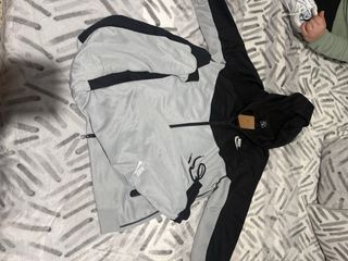 Chaqueta deportiva Nike con un diseño moderno. No tiene nada de desgaste ni uso está el tejido perfecto Negociable - Combinación de colores gris y negro. - Detalle de líneas blancas en las mangas. - Logo de Nike en el pecho.
