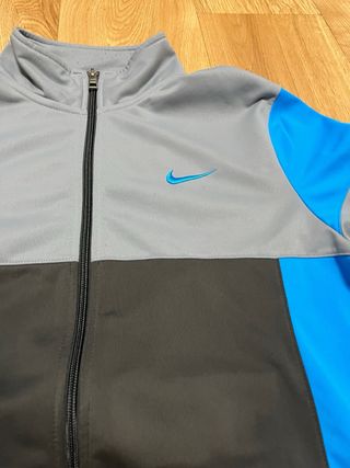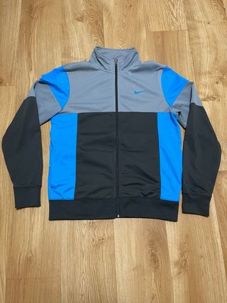 Chaqueta deportiva vintage de la marca Nike con un diseño retro y llamativo. - Combinación de colores gris, azul y negro. - Logo de Nike en el pecho. - Algunas señales del uso (bolitas de la tela, color desgastado, etc...) - Respuestas y envíos muy rápidos