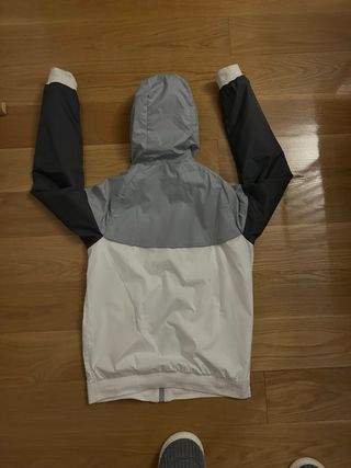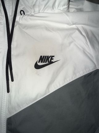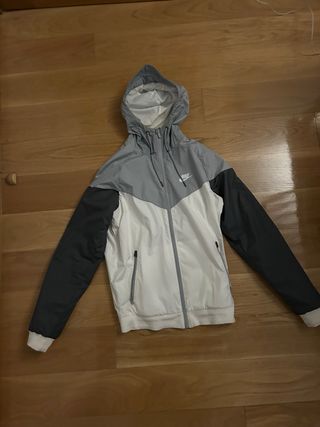 Chaqueta deportiva Nike con cremallera. Está en buen estado. - Diseño bicolor en gris y blanco. - Cremallera frontal. - Capucha.