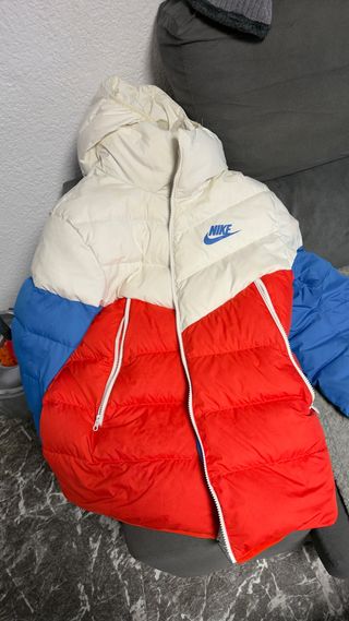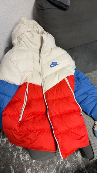 Chaqueta acolchada con diseño moderno y llamativo. - Paneles de color blanco, rojo y azul. - Logo de Nike en el pecho. - Capucha integrada.
