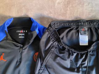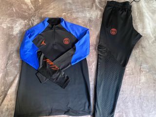 Conjunto deportivo de chándal con diseño moderno. - Chaqueta con cremallera parcial y mangas de color azul. - Pantalón largo negro con detalles gráficos. - Logos de Nike Jordan y PSG visibles.