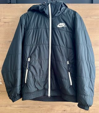 Bonita chaqueta Nike, usada pero muy bien conservada. Diseño original, la cremallera no está centrada. Dos tejidos diferentes. Parte trasera rellena de plumón. Muy ligera y cómoda. Mide 48 CMS de ancho y 58 de largo. Parte delantera redondeada