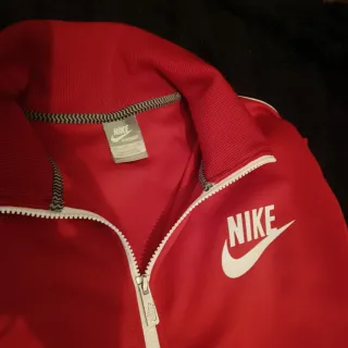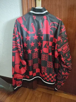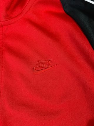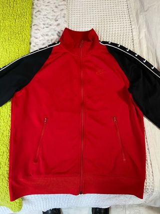 Chaqueta deportiva Nike con un diseño moderno y llamativo. - Mangas de color negro. - Cuerpo principal de color rojo. - Detalle de logo Nike bordado en el pecho. - Cremallera frontal completa. - Bolsillos laterales con cremallera.