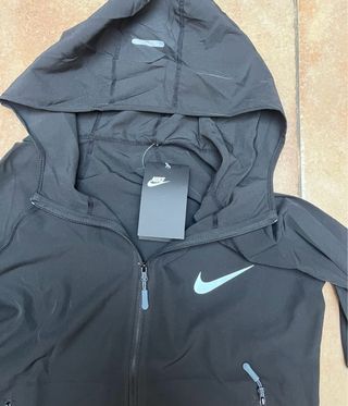 Chaqueta deportiva Nike para running. - Diseño ligero y transpirable. - Capucha integrada para mayor protección. - Cremallera frontal completa. - Logo de Nike reflectante.