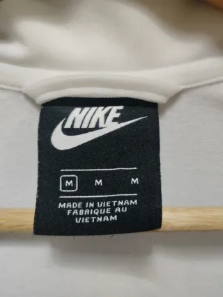 Chaqueta deportiva Nike Tech Fleece en color blanco. Presenta un diseño moderno con detalles en beige y negro. - Cremallera frontal completa. - Capucha integrada. - Bolsillos laterales. - Puños y bajo elásticos.