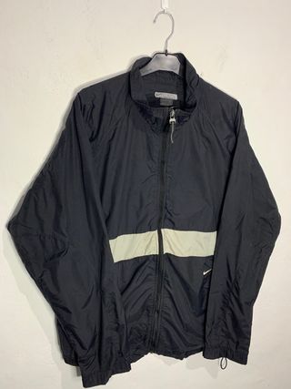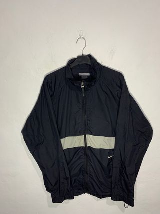 Chaqueta cortavientos vintage de la marca Nike. - Diseño en color negro con banda horizontal gris. - Cierre de cremallera frontal. - Logo de Nike en la parte frontal.