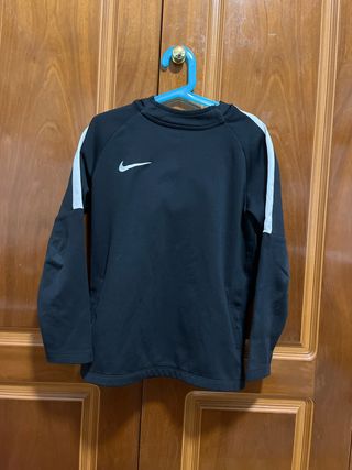 Chaqueta deportiva Nike en color negro. Presenta un diseño moderno y cómodo. - Logo de Nike en blanco en el pecho. - Rayas blancas en las mangas. Talla s de niños