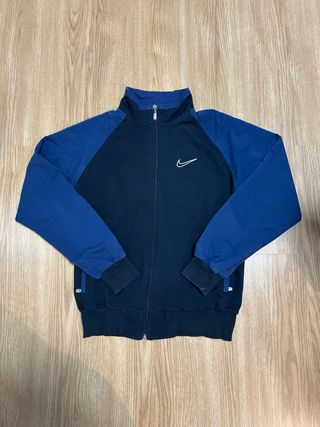 Chaqueta deportiva vintage de la marca Nike, con un diseño clásico y atemporal. - Mangas de color azul. - Cuerpo principal en color negro. - Logo de Nike bordado en el pecho.