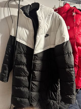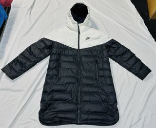 Chaqueta larga de la marca Nike, con un diseño moderno en dos tonos. - Diseño bicolor: blanco en la parte superior y negro en la inferior. - Logo de Nike visible en el pecho.