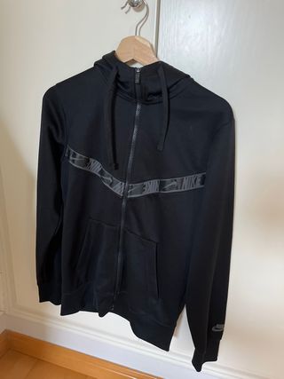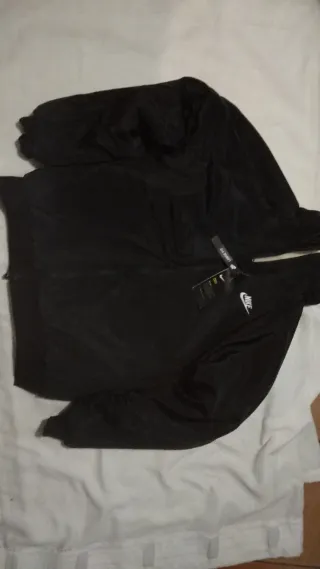 Chaqueta Nike negra, con cremallera. en una manga tiene un pequeño quemazo. Por lo d3mas esta perfecta.