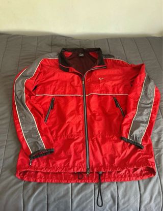Chaqueta deportiva estilo vintage de Nike. Presenta un diseño llamativo en rojo con detalles en gris en las mangas y el cuello. - Cierre frontal con cremallera. - Bolsillos laterales con cremallera. - Puños y cintura ajustables con cordón.