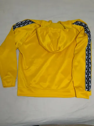 Chaqueta deportiva Nike de color amarillo brillante con detalles en las mangas. Capucha y bolsillos. La chaqueta está como nueva, apenas usada. - Cremallera frontal completa. - Bolsillos delanteros. - Capucha. - Logo de Nike en el pecho.