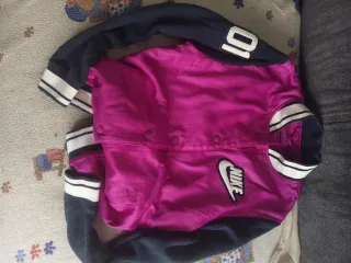 Chaqueta deportiva original Nike en color rojo, ligera pero abrigada gracias al interior tipo forro polar. Tiene cremallera completa, cuello alto, bolsillos laterales y detalles reflectantes en las mangas. Talla L En muy buen estado, sin manchas ni roturas. Perfecta para deporte, senderismo o uso diario. - Color principal rojo. - Detalles en gris y blanco en las mangas. - Logo de Nike visible en el pecho.