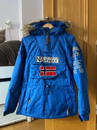 Chaqueta estilo anorak de Geographical Norway en color azul. Presenta un diseño moderno con detalles inspirados en la exploración. - Capucha con pelo sintético. - Bolsillo frontal tipo canguro. - Parches con el logo de la marca y la bandera de Noruega. - Cierre de cremallera parcial en el cuello. - Puños ajustables.